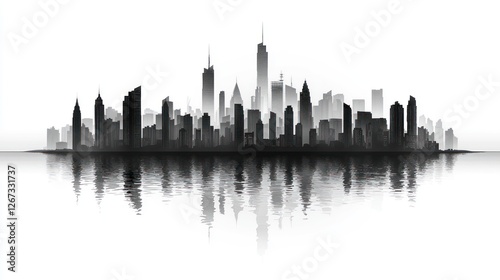 Cityscape skyline reflection, urban waterfront, misty background, design element