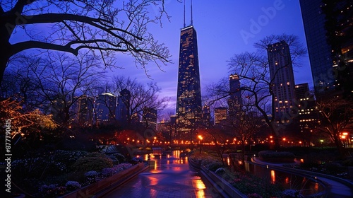 Cityscape with Illuminated Skyscrapers at Dusk