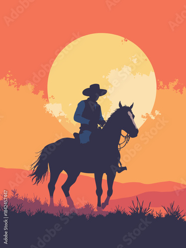 Classic American cowboy on a horse, silhouette against a sunset, hat tipped low, dust kicking up, western movie poster aesthetic