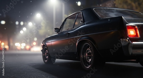 Classic Black Muscle Car Parked on a Wet City Street at Night Illuminated by Street Lights, Cinematic Rendering
