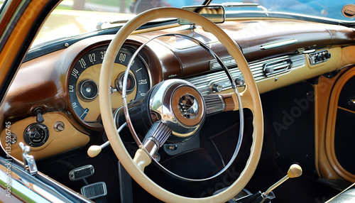 Classic Car Interior: Steering Wheel, Dashboard, and Gauges