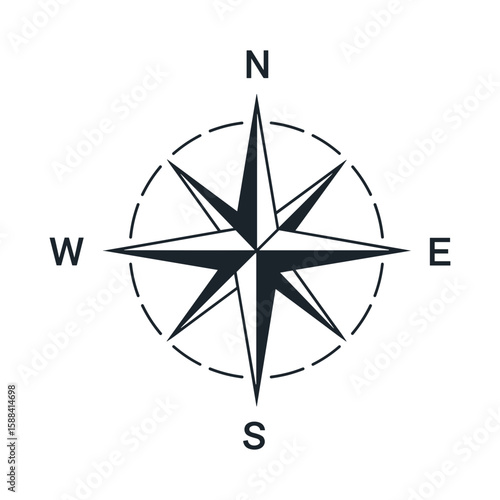Classic compass rose with cardinal directions, nautical design illustration, adventure concept, copy space
