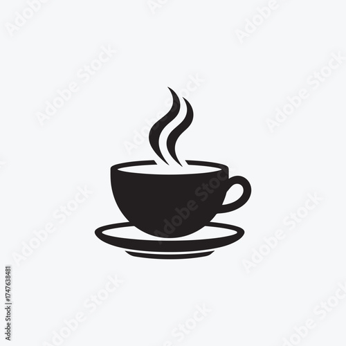 classic hot coffee or tea cup with steam rising on a saucer black solid silhouette vector icon.