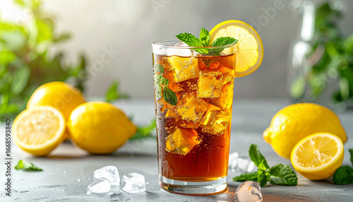 Classic iced black tea in tall glass with lemon wedges, ice cubes and mint leaves. Tasty beverage