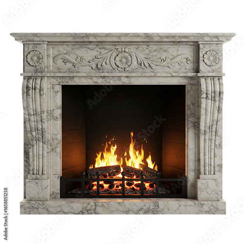 Classic marble fireplace with decorative design on Isolated Transparent Background