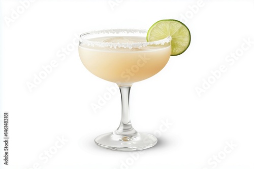 Classic Margarita Cocktail with Lime Garnish on White Background.