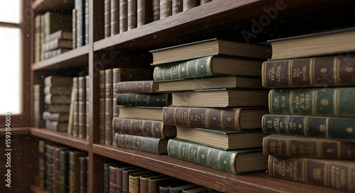 Classic office shelf stacked with worn-out encyclopedias and journals
