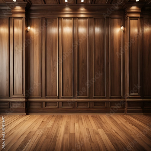 Classic premium luxury wood paneling wall background or texture. Highly crafted traditional wood paneling wall and floor, with a frame and column pattern, Extra wide format. Hand edited .
