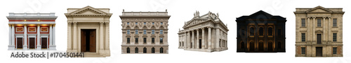 Classical architectural facade set including various ornate, columned, pedimented, and entrance designs isolated. Perfect for historical and urban projects.