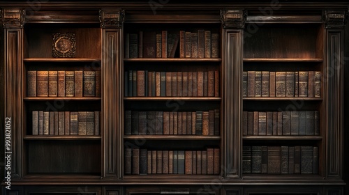 Classical Wooden Bookcase Filled with Books Against Dark Background. AI generated illustration