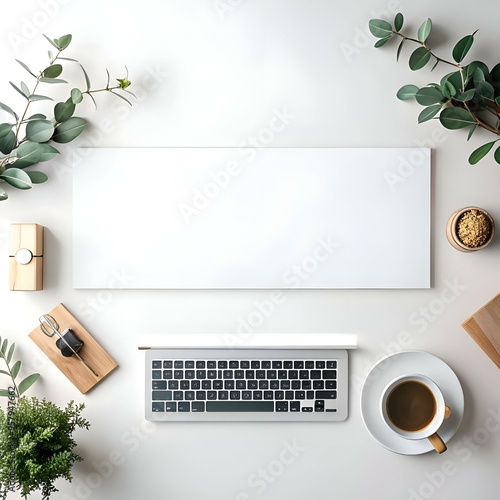 Clean and minimal workspace mockup with a blank white surface. keyboard. coffee cup. and greenery.
