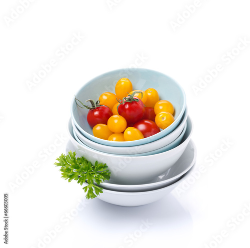 clean bowls, assorted fresh cherry tomato and parsley, isolated