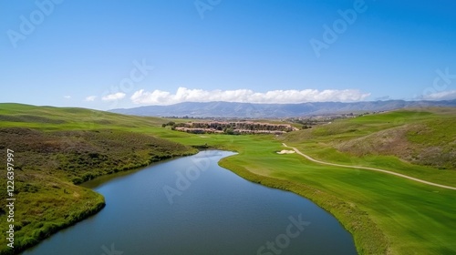 clean energy solar marketing concept. Scenic aerial view of a golf course beside a serene lake and rolling green hills.