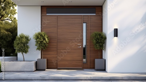 Clean entrance door by wooden with perfect matching white wall to make it homey. Generative AI Technology