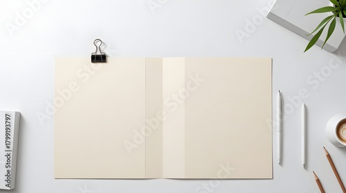 Clean modern desk setup with open notebook, pens, coffee, and plant for professional branding or creative projects
