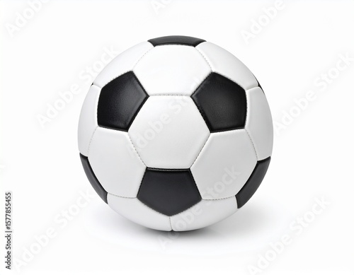 Clean white background showcases a glossy black-and-white soccer ball with sharp edges