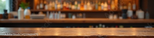 Clean wooden table top, blurred bar background, still life, high angle