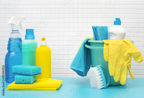 Cleaners and detergents in bucket, accessories for cleaning various surfaces and rooms blue background