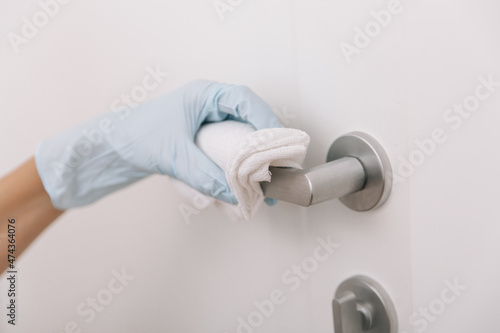 Cleaning black door handles with an antiseptic wet wipe in blue gloves. Sanitize surfaces prevention in hospital and public spaces against corona virus. Woman hand using towel for cleaning.