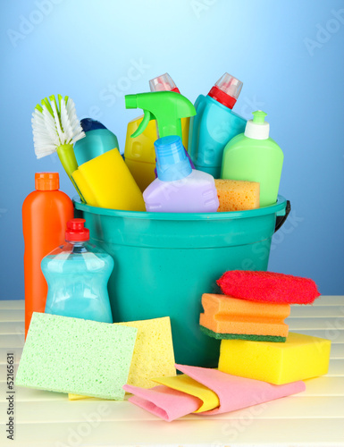 Cleaning items in bucket on color background