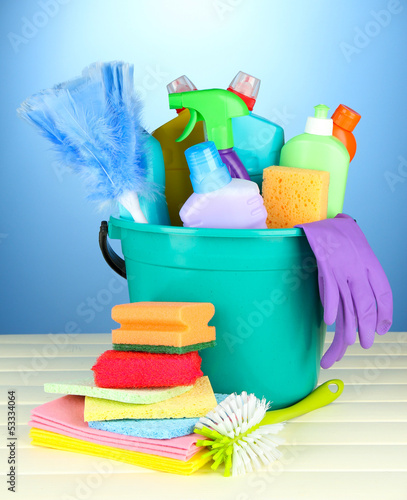 Cleaning items in bucket on color background