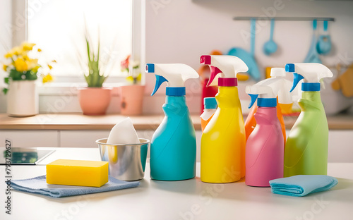 cleaning items on wooden table and blurry modern kitchen background. Washing set colorful with copy space banner.
