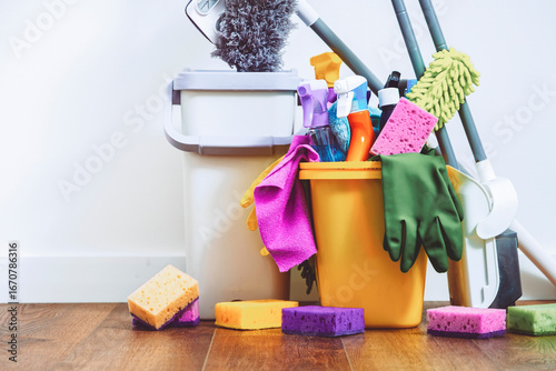 Cleaning products, household chemicals bottles and sprays, rags, sponges in orange bucket for washing the floor, brushes, broom for wiping and dusting