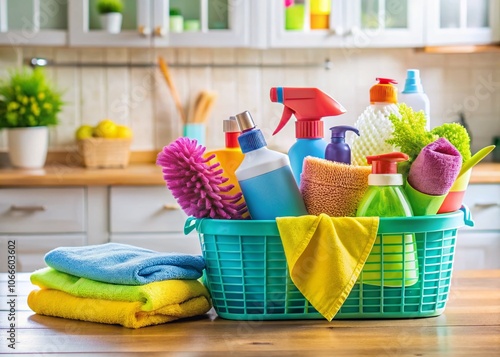Cleaning Supplies and Towels Basket Display for Home Organization, Perfect for Spring Cleaning and Tidy Living Spaces, Ideal for Stock Photos and Home Decor Inspiration