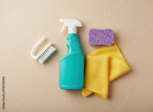cleaning supplies arrangement with spray bottle, scrub brush, purple sponge, and yellow cloth on beige background