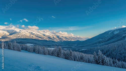 Clear blue sky over a snowy landscape with trees, winter scenery, seasonal change