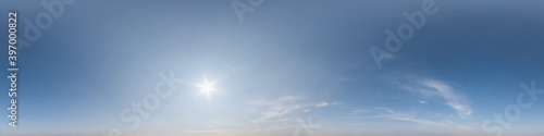 clear blue sky with white beautiful clouds. Seamless hdri panorama 360 degrees angle view with zenith for use in 3d graphics or game development as sky dome or edit drone shot