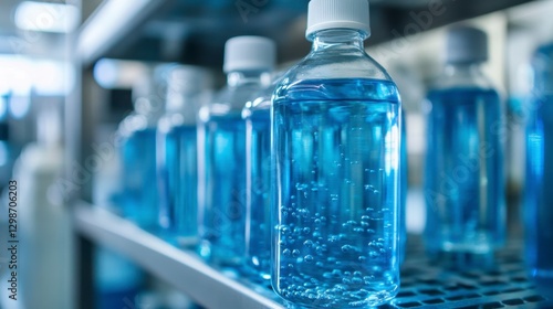 Clear Bottled Liquid with Bubbles on Shelf in Modern Laboratory Setting
