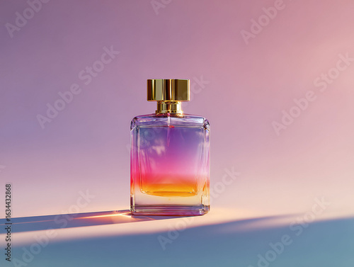 Clear perfume bottle with gradient pink-to-yellow oil-like substance, gold neck and lid, set against blurred pink-purple background, suggesting a sunset theme No texts visible, present - AI-Generated