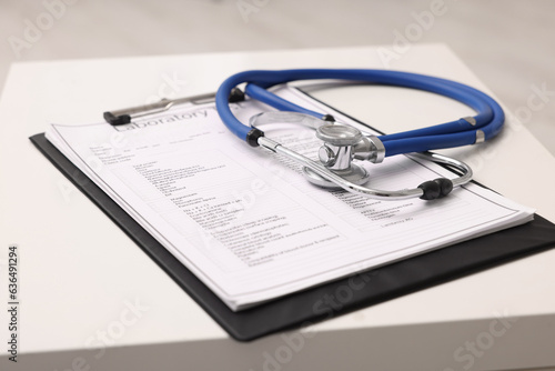 Clipboard and stethoscope on white table in clinic, closeup. Doctor's workplace