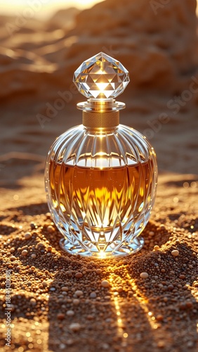 close perfume bottle sandy beach bottle clear glass has diamond shaped stopper top liquid inside bottle golden brown color appears liquid perfume background blurred seems outdoor setting rocks sand
