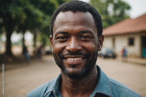 Close portrait of a smiling 40s Sao Tomean man looking at the camera, Sao Tomean outdoors blurred background