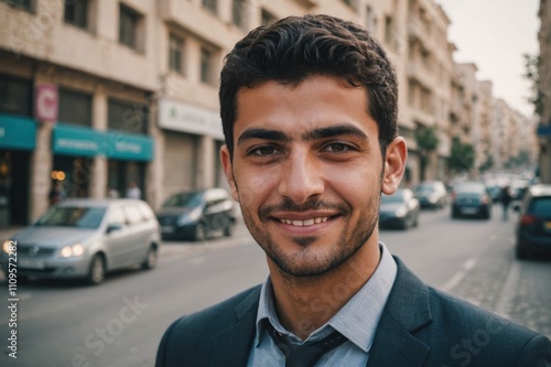 Close portrait of a smiling young Palestinian businessman looking at the camera, Palestinian big city outdoors blurred background