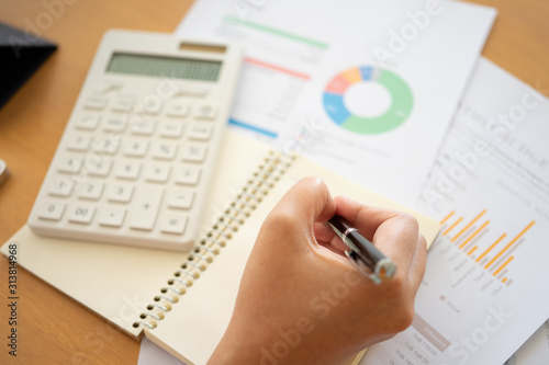 Close shot of businesswoman hands holding a pen writing something on the paper on the foreground in office. Recording concept. Using smartphone tablet. Freelance Work, Business concept