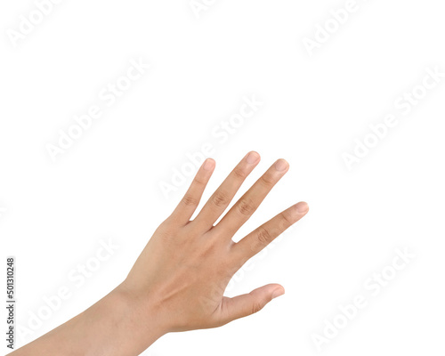 Close up Asian female hand show Number Five finger, palm hand in back, sign arm and hand isolated on a white background copy space symbol language