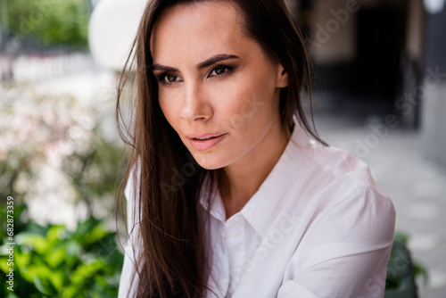 Close up cropped portrait of pretty nice peaceful lady daydreaming enjoy warm weather free time outside