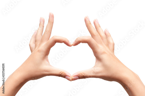 Close up female hands making sign heart by fingers isolated on white background. Love concept