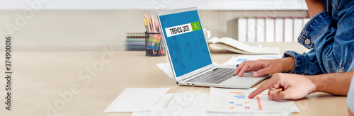 close up hand creative designer team meeting and brainstorming trends 2021 with paperwork and online data on laptop at modern office.business planning concept