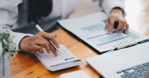 Close up hand of business woman accountant calculating budget of the company with calculator, Chart Graph Analysis