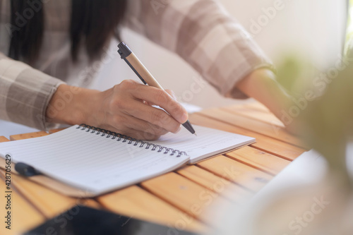 Close up hand of business women use pen writing document paper. Female hand close up writing with a blue pen on a white sheet. Woman writes information on a piece of paper.