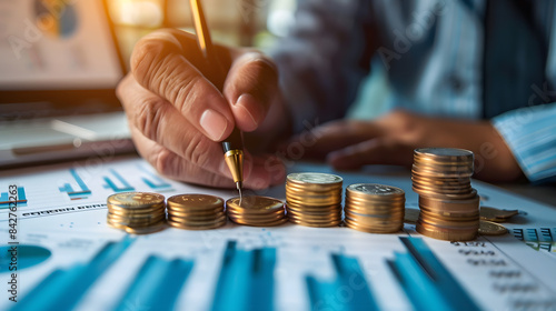 Close up of a businessman sketching a growth graph and financial chart with a stack of coins on the table