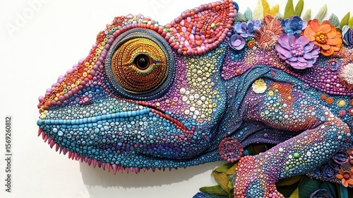 Close up of a colorful chameleon sculpture covered in small beads and decorative flowers art piece