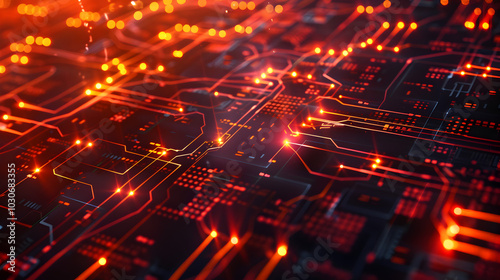 Close Up of a Computer Circuit Board .Glowing Technological Circuit Board with Luminous Interconnected system architecture, digital interface, tech components.
