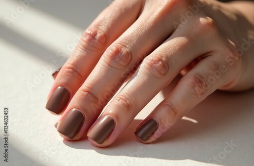 Close up of a girl's hand with a neat manicure, nails in Mocha Mousse color.