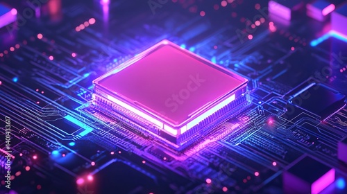 Close up of a glowing pink and blue computer chip on a circuit board with visible connections