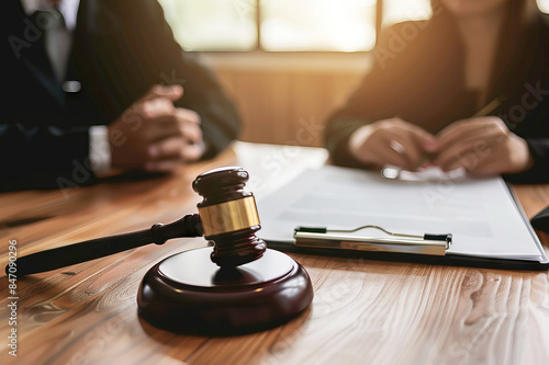 close up of a judge gavel on the desk with Lawyers in a legal consultant office in background